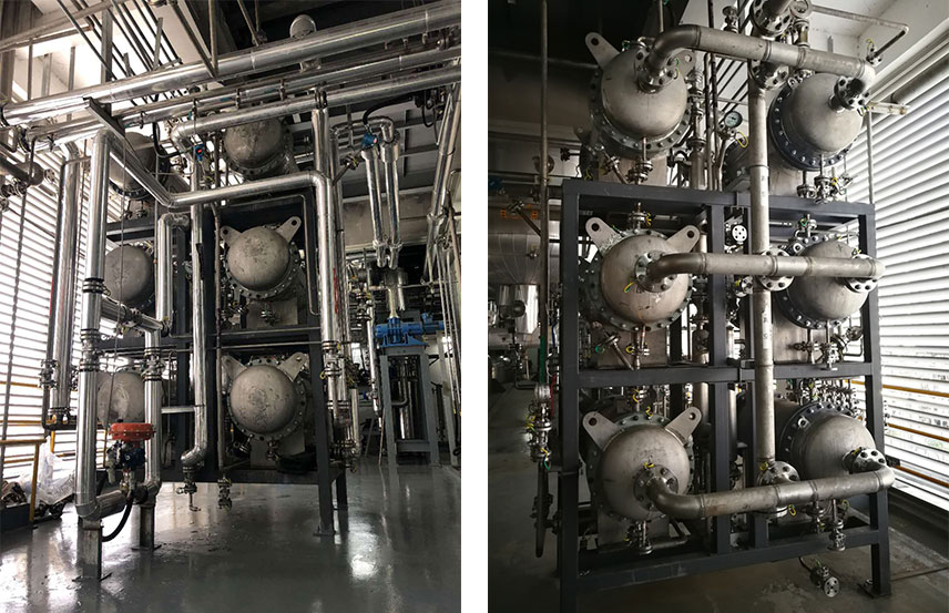 本裝置利用分子篩膜進行二氯甲烷的深度脫水,年處理量4000噸,原料含水0.2%,要求產(chǎn)品含水小于200ppm,且不允許升溫操作以免脫氯。2019年9月,本裝置順利開車,二氯甲烷產(chǎn)品的含水率滿足合同要求,設(shè)備連續(xù)穩(wěn)定運行。本項目是國際范圍內(nèi)分子篩膜用于有機物深度脫水的首次成功案例。