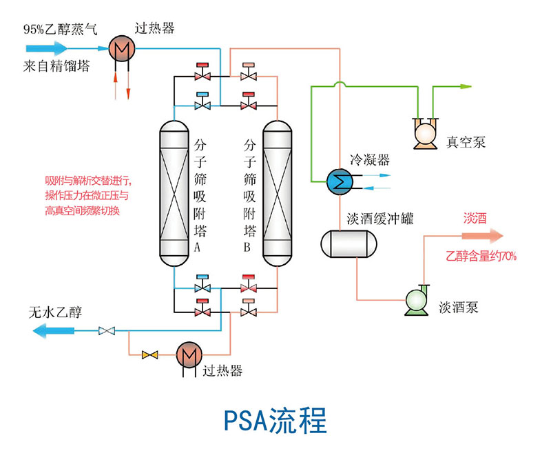 近年來,全球都在尋求建立低碳、高效、環(huán)保的新型能源供應體系,以生物乙醇為代表的生物質(zhì)燃料得到了普遍重視。生物乙醇以玉米、木薯、甘蔗、秸稈等為原料,經(jīng)生物發(fā)酵得到稀乙醇溶液,再采用多塔精餾工藝除去其中的醛酮酯酸類雜質(zhì),得到體積濃度95%的含水共沸乙醇。生物乙醇的精制脫水主要包括共沸精餾、萃取精餾、分子篩吸附等工藝,目前,工業(yè)上大規(guī)模采用的是分子篩變壓吸附(PSA)技術,但是PSA過程的非穩(wěn)態(tài)操作和淡酒的產(chǎn)生是兩個無法解決的問題。